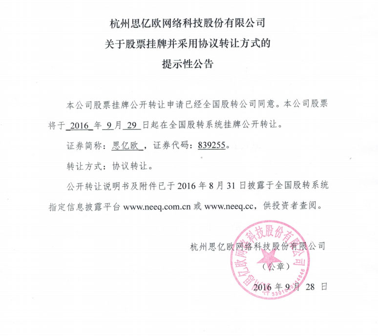 思億歐:關于公司股票將在全國股份轉讓系統掛牌公開轉讓的提示性公告